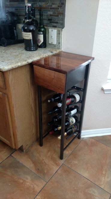 We were asked to design and build these two unique pieces. After a couple meetings to determine what the client wanted, this is what developed. The bookshelf (above) features a one off waterfall edge shelf. The mesquite wood top is beautifully mitered to follow the contour of the supporting steel tube. The tops were made and finished by Nick Sziklai with Summerwood Building. Below is a cool wine cabinet with built in metal drawer.